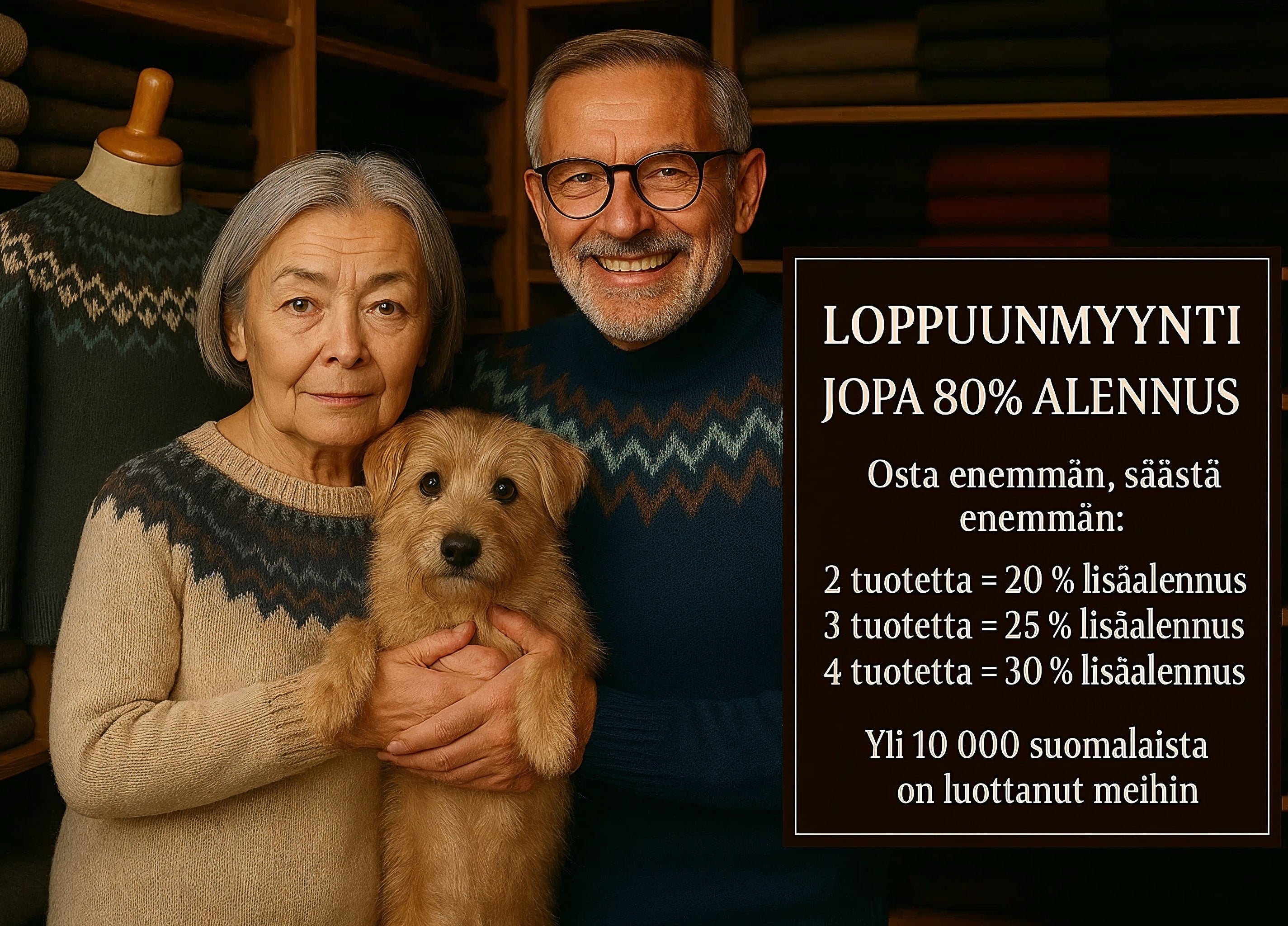Tämän luvun päättyessä haluan ilmaista sydämellisen kiitollisuuteni teidän uskomattomasta tuestanne vuosien varrella. Kiitokseksi tarjoamme lopullisia alennuksia jopa 80% käsintehdyistä islantilaisista villapaidoistamme – jokainen kappale on valmistettu huolella, perinteitä kunnioittaen ja lämpimästi.